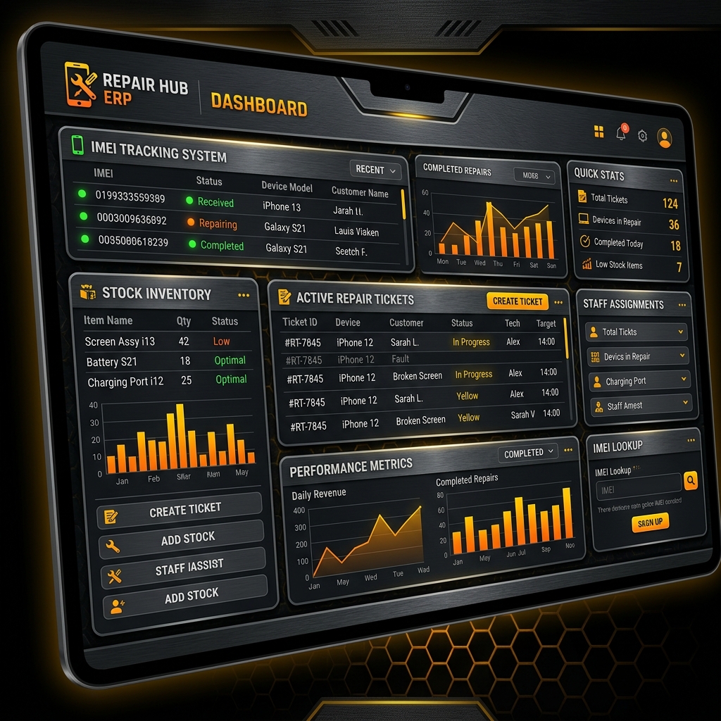 ERP especializado para assistências técnicas de celulares com gestão de IMEI, ordens de serviço e estoque inteligente.