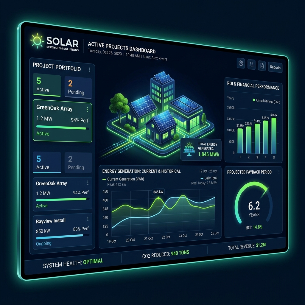 Plataforma para dimensionamento, venda e gestão de projetos de energia solar fotovoltaica com cálculos automatizados.