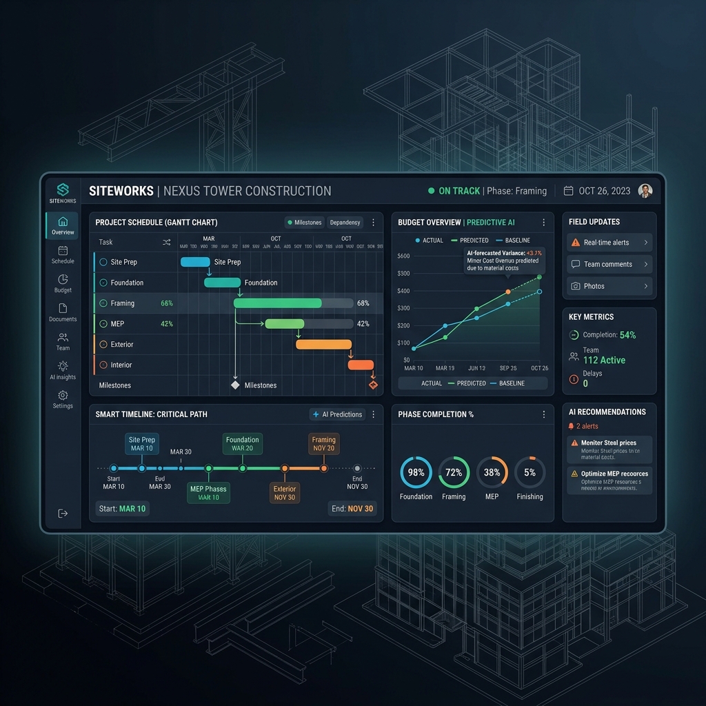 Gestão completa de obras e projetos de construção civil com cronogramas inteligentes, controle de custos e IA preditiva.